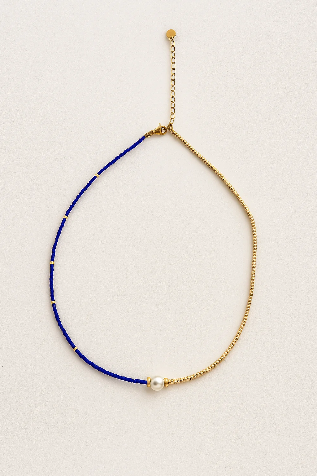 En contraste, la otra mitad del collar está compuesta por un hilo azul vibrante, decorado con pequeños acentos dorados que aportan textura y dinamismo. Este detalle artesanal introduce un toque bohemio y moderno, creando una dualidad entre lo clásico y lo contemporáneo. El azul profundo evoca serenidad, creatividad y confianza, convirtiendo al collar Lina en una pieza emocionalmente poderosa.