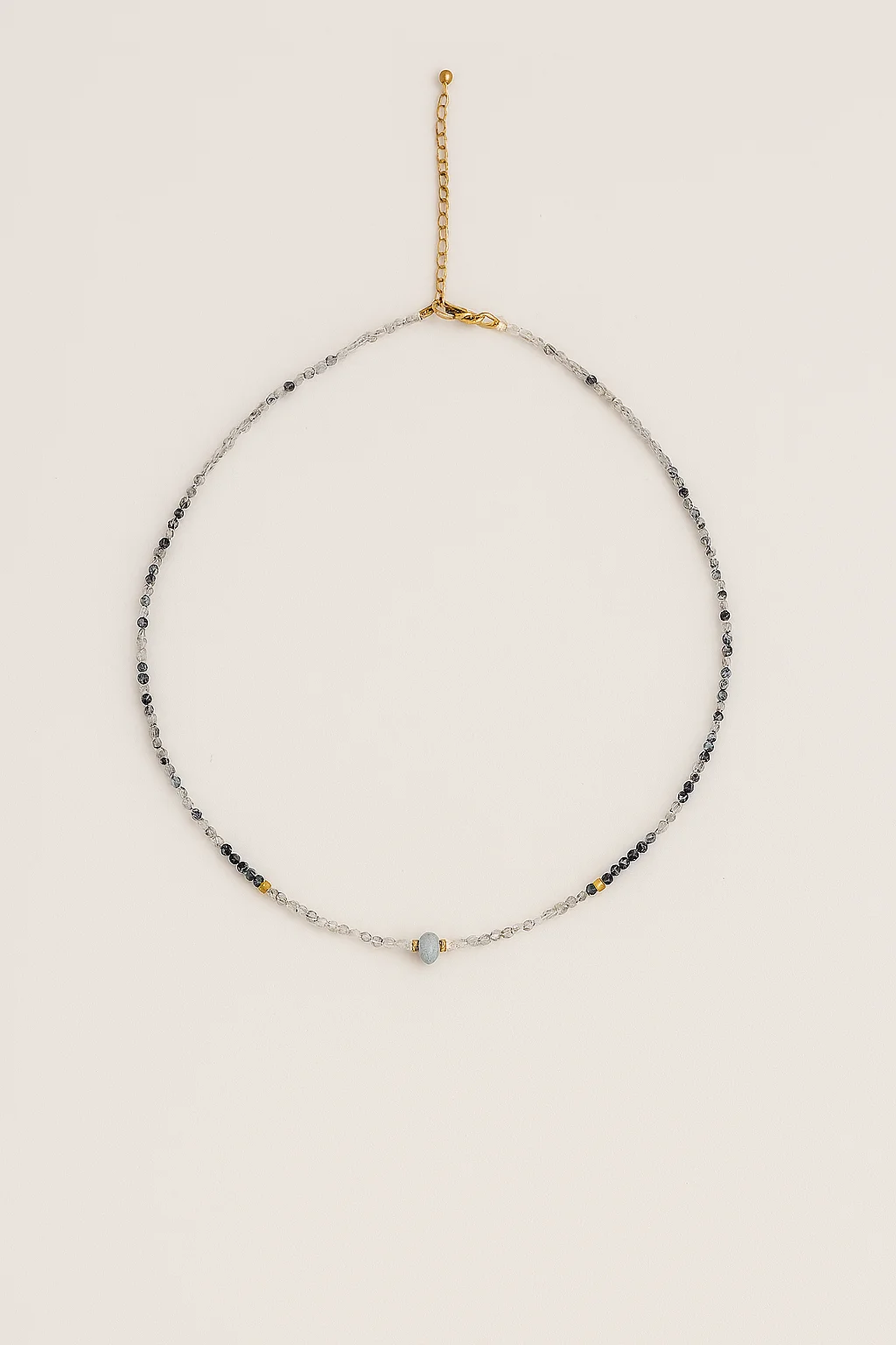 El collar de cuentas con piedra central Mica es una pieza de joyería delicada y moderna que destaca por su diseño minimalista y su paleta de colores neutros. Compuesto por pequeñas cuentas facetadas en tonos negros, grises y dorados, este collar ofrece una estética equilibrada, ideal para quienes buscan un accesorio discreto pero con personalidad.