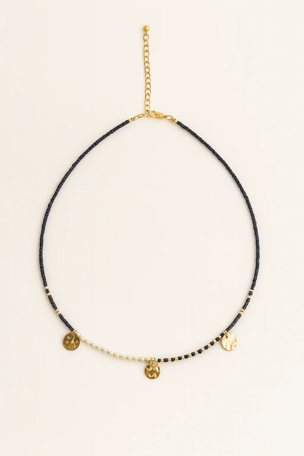 El cierre del collar es un broche dorado con cadena de extensión, lo que permite ajustar su longitud según la ocasión o el tipo de escote. Esta característica lo hace ideal para llevarlo solo o en combinación con otras piezas, creando capas que expresan personalidad y estilo propio.