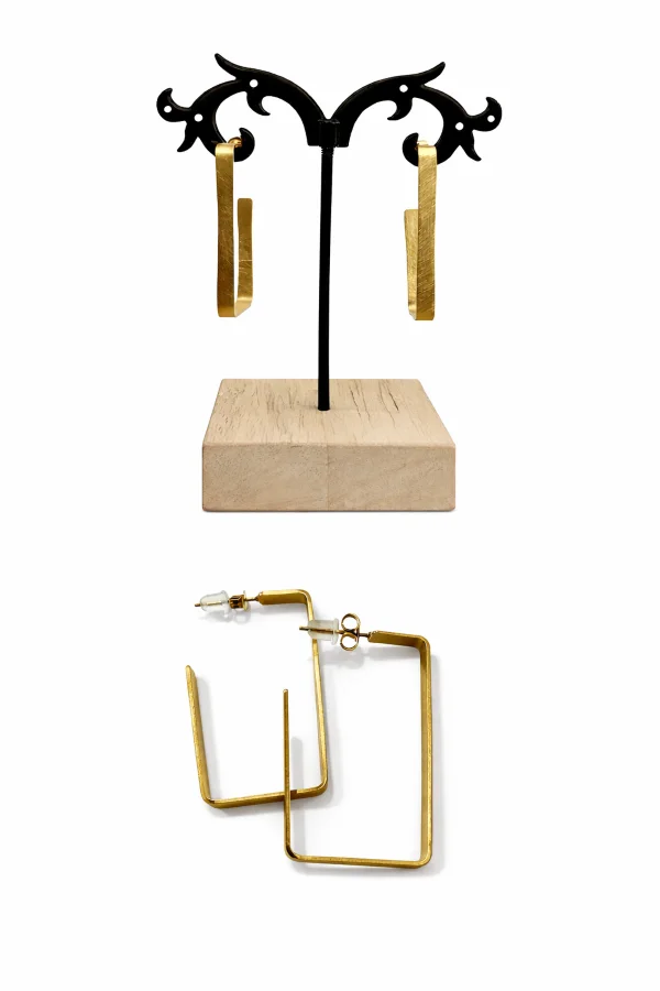 Los pendientes Ainara reinterpretan la geometría clásica desde una mirada contemporánea. Su silueta rectangular, limpia y equilibrada, se combina con una textura martillada que aporta un carácter artesanal sutil, casi escultórico. El acabado en acero dorado mate suaviza el brillo habitual del dorado y lo transforma en una luz más íntima, moderna y sofisticada. Es un mate que no apaga, sino que envuelve: cálido, elegante y tremendamente versátil.