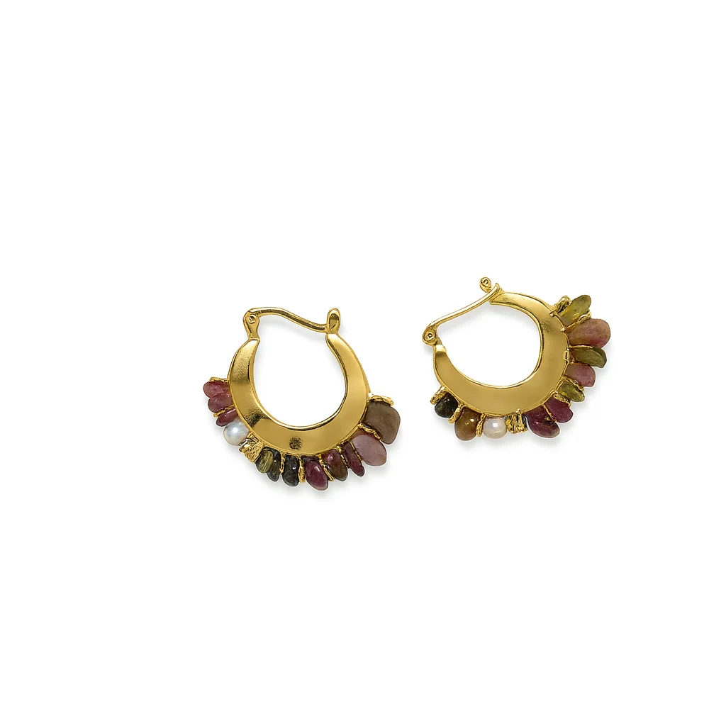 La versión en turmalina es ideal para quienes buscan una joya vibrante y llena de energía. La turmalina es un mineral muy apreciado por su variedad de tonos, que pueden ir desde verdes intensos hasta rosas suaves. Cada fragmento aporta un matiz diferente, creando un conjunto colorido y equilibrado. Combinada con el aro de acero inoxidable dorado, la turmalina ofrece un contraste precioso que aporta luz y personalidad a cualquier look. Es una opción perfecta para quienes disfrutan de accesorios con carácter y un toque bohemio.