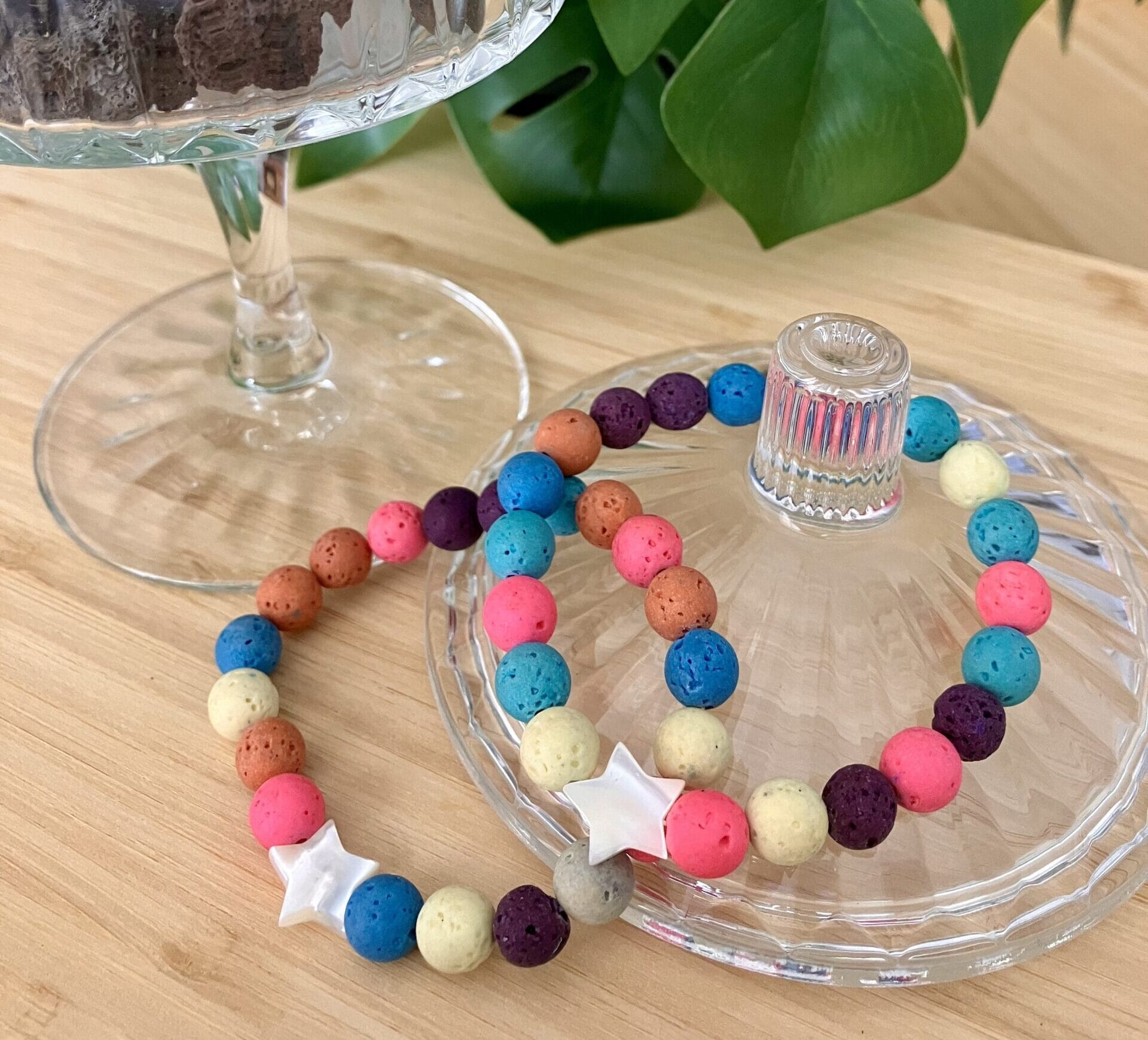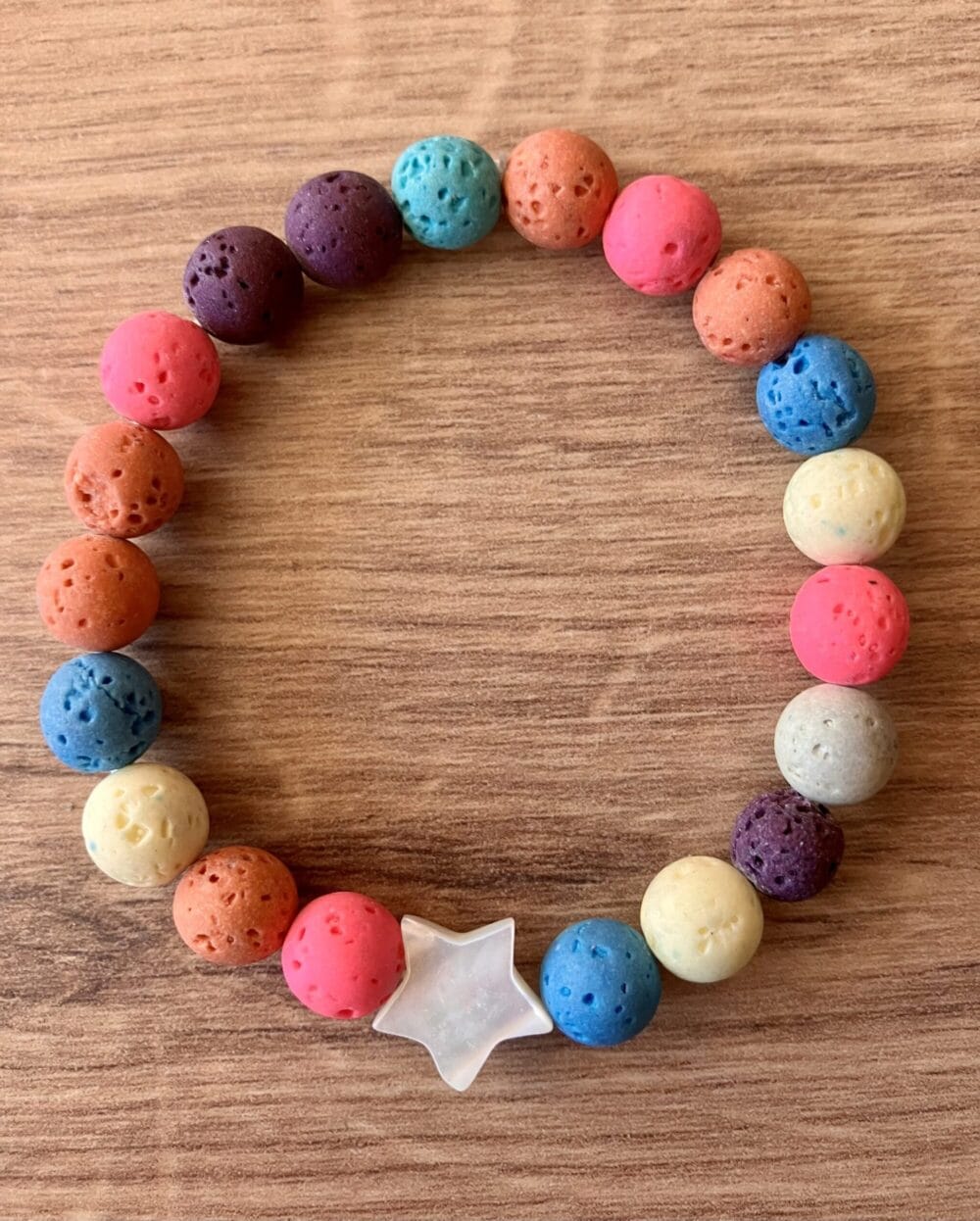 Complementa tu outfit estival con nuestra pulsera Bali, elástica, diseñada en piedra volcánica multicolor y rematada con una elegante estrella de nácar.
