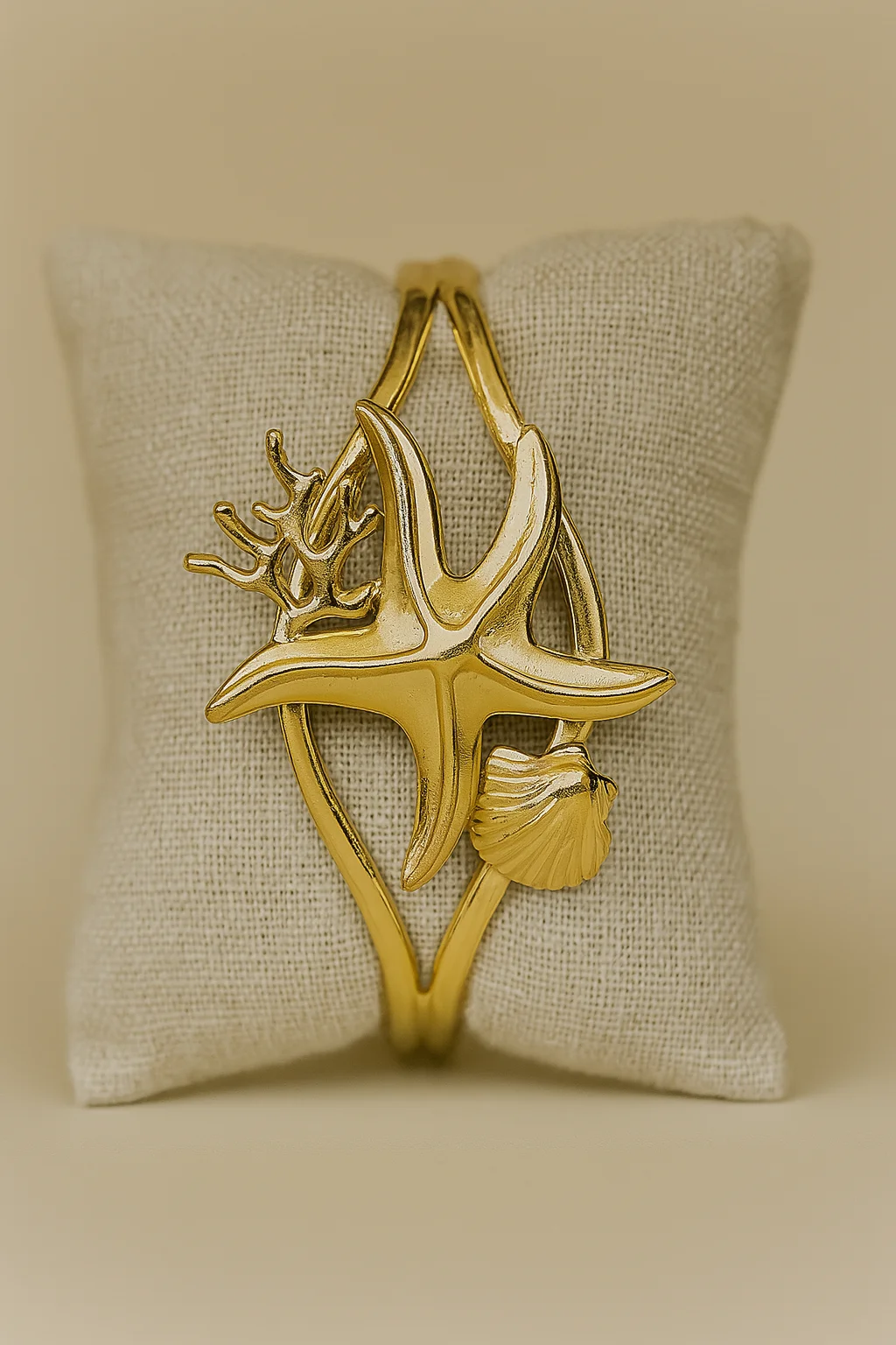 La pulsera dorada Mar es una joya que captura la esencia del océano y la transforma en una pieza de diseño elegante, artesanal y con gran personalidad. Inspirada en la riqueza visual del mundo marino, esta pulsera incorpora tres elementos icónicos: una estrella de mar central, una concha en el lateral y ramas que evocan el coral, todos esculpidos con precisión y delicadeza. Cada detalle está cuidadosamente trabajado para transmitir movimiento, textura y una estética orgánica que conecta con la naturaleza.